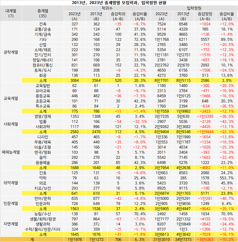 한국교육개발원의 학과 분류 체계에서 중 계열 기준으로 살펴보면, 기초 학문 분야 중심의 쇠퇴가 더욱 뚜렷하다. 과학자를 양성하는 순수 학문인 자연계열에서는 생활과학이 2642명(-24.4%) 감소했다. 의약계열과 함께 정원이 3% 증가한 공학계열에서도 계열별 차이가 뚜렷하다. 산업 정밀/에너지 전기/전자 소재/재료 계열은 감소하고, 기타 계열이 증가한 것이 두드러졌다. 토목/도시 1506명(-24.5%), 정밀/에너지 657명(-19.1%), 전기/전자 1570명(-12.3%)의 감소폭이다. 5557명(89.5%) 증가한 기타 계열은 응용공학 교양공학 기전공학(기계공학과 전자공학을 융합한 학문)으로 로봇시스템 스마트모빌리티 공학자율전공 등이다. 최근 산업 경향에 따른 융복합 중심 학과의 입학 정원이 증가한 것이다.