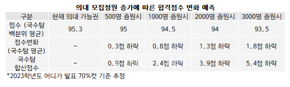 종로학원이 대학별 공시(어디가) 기준 2023학년 전국 의대 지원 가능 점수를 분석한 결과 정시 70% 컷 국수탐 세 과목 평균 기준 95.3점인 것으로 나타났다. 이때 종로학원의 분석에 따르면 의대 모집 정원 증원에 따라 의대 합격선은 낮아진다. 500명 증원될 경우 0.3점 하락한 95점, 1000명 증원 시 0.8점 하락한 94.5점, 2000명 증원 시 1.3점 하락한 94점, 3000명 증원 시 1.8점 하락한 93.5점까지 합격선이 내려간다. 국수탐 합산 점수로 살펴보면 같은 구간 0.9점 2.4점 3.9점 5.4점까지 하락한다는 분석이다.