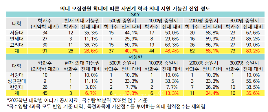 2023학년 기준 SKY 자연계 학과(의약계열 제외)는 서울대 34개, 연대 27개, 고대 30개 학과로 총 91개다. 이 중 현재 의대 지원이 가능한 학과는 26개(28.6%)다. 서울대 12개, 고대 11개 학과, 연세대 3개 순이다. 이때 의대 증원 규모에 따라 의대 지원/합격이 가능한 학과 역시 늘어나게 된다. 500명 증원 시 SKY 합산 37개(40.7%), 1000명 증원 시 44개(48.4%), 2000명 증원 시 62개(68.1%), 3000명 증원 시 73개(80.2%)의 추이다. SKY 학생 중 40%에서 80%에 해당하는 학생들이 의대로 빠져나갈 가능성도 높아지는 셈이다.