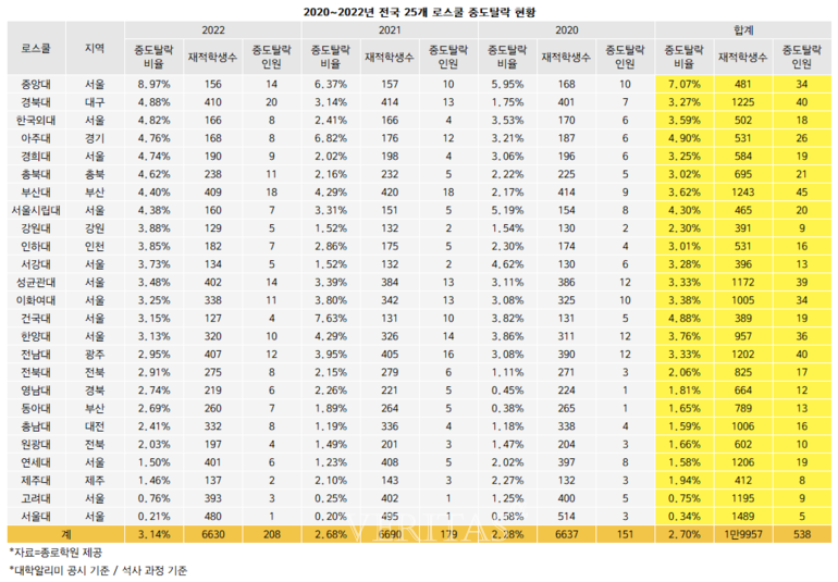 대학별로 살펴보면 중대 로스쿨의 중도탈락 비율이 가장 높았다. 재적 학생 156명 중 14명이 이탈한 결과다. 2021년 6.37%(10명/157명)에서 더 증가했다. 이어 경북대 4.88%(20명/410명), 외대 4.82%(8명/166명), 아주대 4.76%(8명/168명), 경희대 4.74%(9명/190명)까지 중도 탈락률 톱5다. 이어 충북대 4.62%(11명/238명), 부산대 4.4%(18명/409명), 서울시립대 4.38%(7명/160명), 강원대 3.88%(5명/129명), 인하대 3.85%(7명/182명), 서강대 3.73%(5명/134명), 성대 3.48%(14명/402명), 이대 3.25%(11명/338명), 건국대 3.15%(4명/127명), 한대 3.13%(10명/320명), 전남대 2.95%(12명/407명), 전북대 2.91%(8명/275명), 영남대 2.74%(6명/219명), 동아대 2.69%(7명/260명), 충남대 2.41%(8명/332명), 원광대 2.03%(4명/197명), 연대 1.5%(6명/401명), 제주대 1.46%(2명/137명), 고대 0.76%(3명/393명), 서울대 0.21%(1명/480명) 순이다.