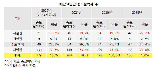 31일 종로학원이 전국 39개 의대의 최근 4년간 중도 탈락자 수를 분석한 결과 지난해 의대 중도 탈락자의 77.7%(139명)가 지방권인 것으로 나타났다. 서울권 17.3%(31명), 경인권 5%(9명)로 수도권이 22.3%인 것과 비교해 무려 3배 이상 차이가 난다. 특히 서울권 의대 중도 탈락률은 2019년 22.7%, 2020년/2021년 19.7%, 2022년 17.3%로 하락하는 반면 지방권은 2019년/2020년 74.6%, 2021년 73.4%, 2022년 77.7%로 매년 70% 이상을 기록하고 있다.