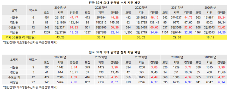 지역인재 선발 유무에 따라 경쟁률에서도 큰 차이가 벌어진다. 지역인재를 운영하는 수시의 경우 수도권 의대의 경쟁률이 압도적으로 높지만 되려 정시의 경우 지방권이 수도권을 압도하기 때문이다. 수시의 경우 39개 의대 기준 수도권(서울/경인권)은 61.33대1(지원 3만3241명/모집 542명), 지방권은 18.05대1(2만2726명/1259명)로 나타났다. 반면 정시의 경우 수도권이 4.89대1(2086명/427명)이지만 지방권은 7.76대1(5764명/743명)로 높게 나타났다. 특히 서울권 3.74대1(1442명/386명)과 비교하면 지방권이 사실상 서울의 2배다. 이는 지방 의대 13개교가 정시에서는 지역인재 선발을 하지 않기 때문이다.