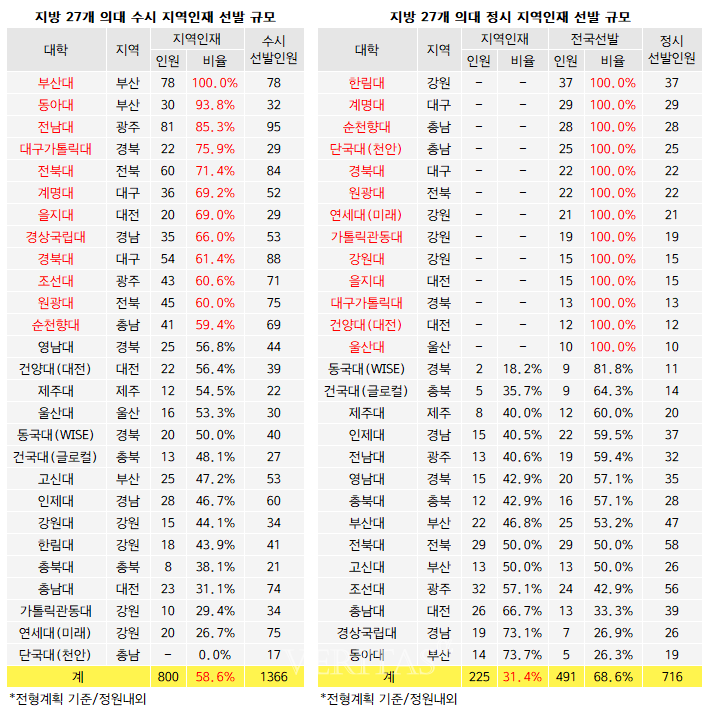 2024학년 기준 지방권 27개 의대의 수시 지역인재 선발 비중은 58.6%로 절반을 웃돈다. 특히 100% 지역인재로 선발하는 부산대를 포함해 17개교는 절반 이상을 지역인재로 선발한다. 부산대 100%, 동아대 93.8%, 전남대 85.3%, 대구가톨릭대 75.9%, 전북대 71.4%, 계명대 69.2%, 을지대 69%, 경상국립대 66%, 경북대 61.4%, 조선대 60.6%, 원광대 60%, 순천향대 59.4%, 영남대 56.8%, 건양대(대전) 56.4%, 제주대 54.5%, 울산대 53.3%, 동국대(WISE) 50% 등 17개교다. 반면 정시에서는 지방권 27개 의대의 지역인재 선발 비율이 31.4%에 불과하다. 특히 한림대 계명대 순천향대 단국대(천안) 경북대 원광대 연세대(미래) 가톨릭관동대 강원대 을지대 대구가톨릭대 건양대(대전) 울산대 등 13개교는 지역인재 없이 모두 전국 단위로 선발한다.