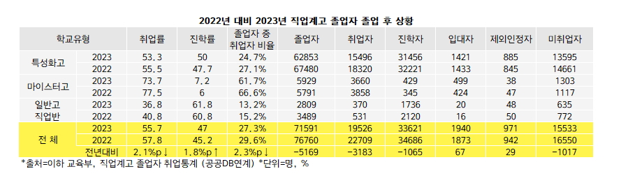 2022년 직업계고 졸업자 취업 통계 조사 결과 올해 졸업자 7만1591명 중 취업자는 1만9526명으로 27.3%에 머물렀다. 이는 교육부가 발표한 취업률 55.7%와는 다른 산출 기준을 적용한 수치다. 취업률은 졸업생 중 대학 진학 입대 등을 뺀 경제 활동 희망자만을 대상으로 하며, 27.3%는 대학 진학과 입대 등을 모두 포함한 전체 졸업자를 대상으로 한 실질 취업 비율을 나타낸다. 같은 방식으로 산출한 실질 취업 비율을 살펴보면 2020년 27.7%, 2021년 28.6%, 2022년 29.6%로 상승하다가 2023년 27.3%로 다시 꺾이면서 여전히 30%를 하회하는 수준이다.