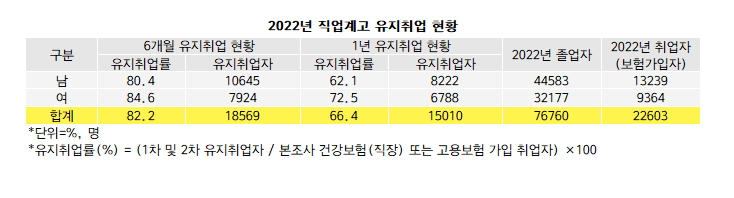 일자리의 질적 수준을 따져볼 수 있는 유지 취업률도 심각하다. 유지 취업률은 졸업생이 취업 상태를 유지하고 있는지 조사하는 통계 자료로, 6개월 기간을 두며 집계한다. 교육부와 한국교육개발원 자료를 살펴보면 지난해 직업계고 취업자의 반년 뒤 유지 취업률은 82.2%, 1년 뒤는 66.4%를 기록했다. 반년 사이 10명 중 2명, 1년 내로는 10명 중 3~4명꼴로 직장을 그만둔 셈이다.