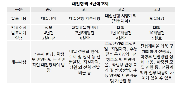 통상 대입은 4년예고제에 따라 진행된다. 4년 전인 중3 2월에 교육부가 발표하는 대입정책을 확인하고, 2년 6개월 전인 고1 8월 말에 대교협이 대입전형 기본사항을 발표한다. 1년10개월 전인 고2 4월 말에 대학들이 전형계획을 공개한 뒤, 10개월 전인 고3 4월 말에 수시 모집요강을 발표하고 8월에 정시 모집요강을 공개하는 일정이다.