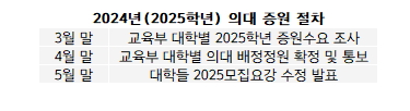 결국 수요자들은 의대확대 등 초대형 이슈가 발생하는 등 역대급 변화들이 예고된 만큼 4월 말 발표하는 대학별 수시요강에 따라 올해 대입전략을 다시 수립해야 한다. 한 전문가는 “의대확대 등은 긴급하게 발생한 이슈가 겹쳤다. 매년 급격하게 뒤바뀌는 교육정책에 수요자들은 혼란스러울 수밖에 없다. 4월 수시 요강이 나오면 입시전형 모집인원 선발비율 전형방법 등의 큰 폭의 변화가 예상된다. 수험생들은 4월에서야 올해 대입에 대한 구체적인 방향을 확인하고 입시전략을 수립할 수 있는데, 올해 예고된 변화만 해도 역대급이라 어떻게 대비해야 할지 감도 오지 않는다. 4월 구체적인 윤곽이 드러나면 갑자기 대폭 바뀐 전형에 결국 수험생들은 사교육 시장에 달려갈 수밖에 없을 것”이라고 불만을 토로했다.