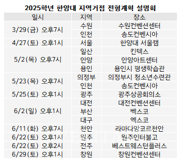 [베리타스알파=신현지 기자] 한양대가 2025학년 지역거점 전형계획 설명회를 실시한다고 최근 밝혔다. 설명회는 이달 29일 수원과 인천을 시작으로 전국을 돌며 진행한다. △4월27일 서울, △5월 2일 일산 안양 용인, 23일 의정부 인천, 25일 광주, △6월 2일 대전/부산/대구, 11일 천안, 22일 원주/전주, 29일 창원에서 진행한다.