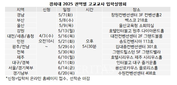 [베리타스알파=김하연 기자] 경희대가 2025학년 고교교사 대상 입학설명회를 5월7일부터 6월20일까지 총 12회 진행한다. 접수는 선착순이며 4월3일 오전10시부터 입학처 홈페이지를 통해 사전예약 가능하다. 단 현장접수는 불가하다. 경희대 관계자는 "접수인원은 아직 미정이며, 신청페이지에서 확인할 수 있다"라고 설명했다.