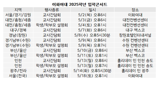[베리타스알파=김하연 기자] 이화여대가 2025학년 상반기 대입정보 안내 프로그램 운영 계획을 공개했다. 학생/학부모/교사를 대상으로 '입학설명회' '교사간담회' '교사 방문상담' '수시/정시 안내영상' '시도교육청 등 설명회' '대교협 수시/정시 박람회' '수시모집 지원전략 설명회' 등 눈길을 끄는 대입정보 안내 프로그램이 풍성하다.