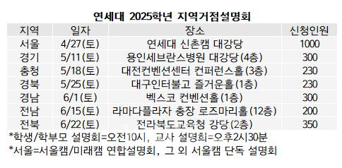 [베리타스알파=신현지 기자] 연세대가 2025학년 대입정보를 안내하기 위해 지역거점설명회를 개최한다고 20일 밝혔다. 설명회는 7회에 걸쳐 진행된다. 내달27일 서울을 시작으로 5월에는 11일 경기, 18일 충청, 25일 경북 설명회가 예정돼 있다. 6월에는 1일 경남, 15일 전남, 22일 전북 설명회가 예정돼 있다. 각 일자별 오전10시에는 학생과 학부모 대상 설명회를 진행하며 같은 날 오후2시30분부터는 교사 대상 설명회를 진행한다.