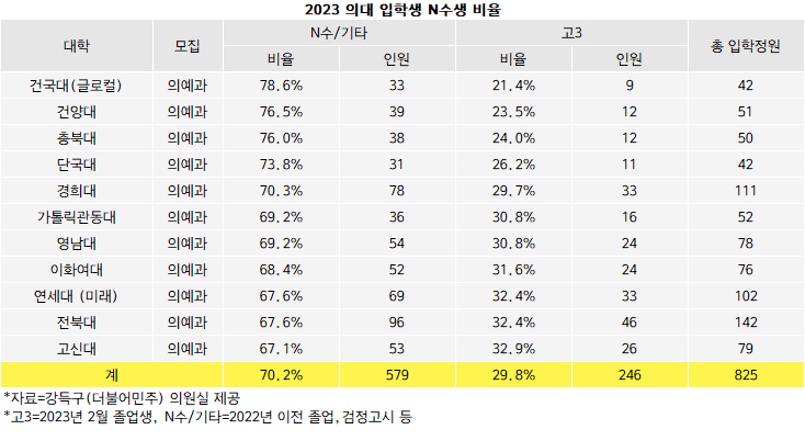2023학년 의대 신입생 중 N수생과 기타(검정고시 등) 인원이 절반 이상을 차지하는 것으로 나타났다. 강득구 의원이 발표한 ‘2023 전국 의대 입학생 고3/N수생 분포 현황’ 자료에 따르면, 39개교 중 자료를 제출한 36개교의 전체 입학생 2860명 중 N수생/기타가 55.9%를 차지했다. 반면 고3 재학생은 1262명으로 44.1%에 그쳤다. 강 의원은 “정부의 의대 2000명 증원으로 의대 정원이 대폭 늘어나면서 고3 재학생은 물론이고 N수생까지 대거 늘어날 것으로 예상된다”며 “수능 준비를 하는 반수생뿐만 아니라 ‘수시’를 준비하는 상위권 이공계 재학생들의 의대 쏠림도 심해질 것으로 우려된다”고 지적했다.