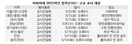 이화여대 관계자는 "’교사간담회’ 이외에도 각 고교별 개별 결과자료를 안내하는 ‘교사 방문상담’과, 입학전형 전반에 대한 진학지도 역량 강화를 위한 ‘교사 직무연수 워크숍’ 프로그램도 별도 운영하니 많은 관심 부탁드린다"고 설명했다.