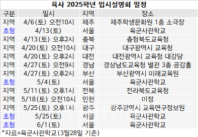 [베리타스알파=신현지 기자] 육군사관학교(이하 육사)가 2025학년 입시설명회를 진행한다고 26일 밝혔다. 설명회는 전국 지역을 방문하거나 육사에 초청해 진행한다. 지역 설명회의 경우 내달6일 제주 설명회를 시작으로 13일 충북, 20일 대구 대전, 27일 경남 부산에서 설명회를 진행한다. 5월의 경우 11일 전북, 18일 인천, 25일 광주에서 설명회를 진행한다. 육사 초청 설명회는 내달 13일, 5월4일, 5월25일, 6월1일에 예정돼 있다. 5월25일과 6월1일 설명회의 경우 원서접수를 앞두고 수험생의 관심이 집중되는 시기인 만큼 같은 날 두 차례 설명회를 실시한다. 그 외 일자는 하루에 한 번 실시하면서 4일간 총 6차례 예정돼 있다.