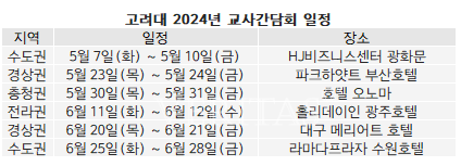 [베리타스알파=신현지 기자] 고려대가 교사간담회 운영 일정을 2일 공개했다. 고교 교사를 대상으로 고대 입학전형과 전년 입시결과 등의 정보를 공유할 예정이다. 간담회는 총 6차례에 걸쳐 진행된다. 수도권의 경우 내달 7일부터 10일까지, 경상권은 23일부터 24일까지, 충청권은 30일부터 31일까지 진행한다. 전라권은 6월11일부터 12일까지다. 경상권은 20일부터 21일까지 운영하며 수도권은 25일부터 28일까지 한차례 더 운영한다. 시간대는 오전10시, 오전11시, 오후1시30분, 오후2시30분, 오후3시30분, 오후4시30분 등 6회차로 나눠 진행된다. 각 시간대마다 40분간 진행된다.