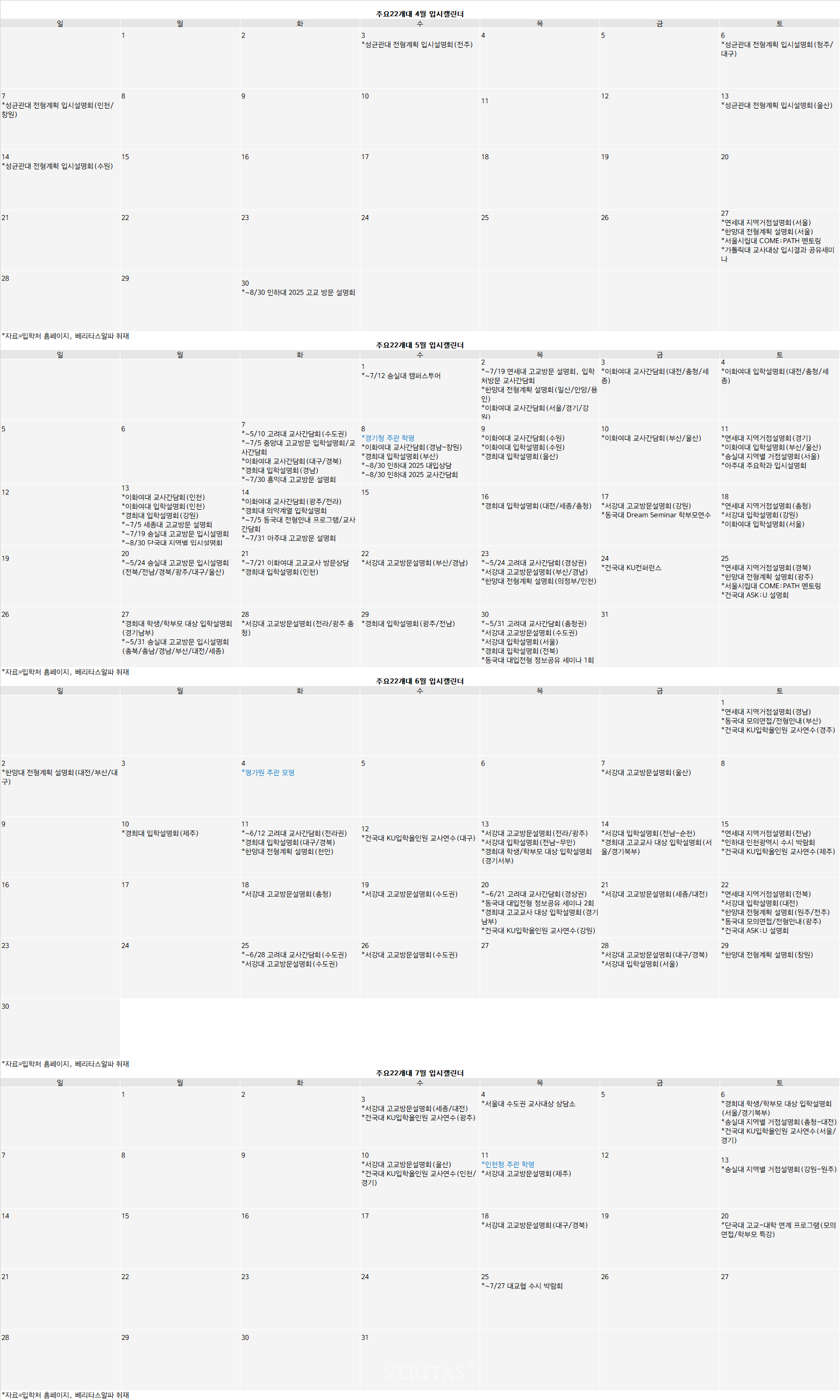 대학마다 설명회 일정을 공개하고는 있지만 수요자가 이를 한눈에 파악하기란 어렵다. 수요자 입장에서는 매일 입학처 홈페이지 공지사항을 체크해야 하기 때문이다. 특히 일부 대학은 입학처 홈페이지를 통해 설명회 일정을 공개하지 않고 있다. 따라서 주요22개대(가톨릭대 건국대 경희대 고려대 국민대 단국대 동국대 서강대 서울대 서울시립대 성균관대 세종대 숙명여대 숭실대 아주대 연세대 이화여대 인하대 중앙대 한국외대 한양대 홍익대)의 대학별 입학처를 통해 취합한 2025학년 대입 관련 프로그램 일정을 정리해보았다.
