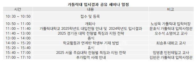 [베리타스알파=신현지 기자] 가톨릭대가 2025학년 대입전형을 소개하고 지난해 입시결과를 안내하는 입시결과 공유 세미나를 개최한다고 8일 밝혔다. 세미나는 27일 오전10시50분부터 오후5시10분까지 가톨릭대 성심교정 콘서트홀에서 진행된다. 중식도 제공된다. 세미나는 개회사와 가톨릭대 2025학년 대입전형 안내와 2024학년 입시결과 안내, 2025 경기권 대학 전형별 특징과 지원 전략, 학교활동과 연계한 학생부 기재 방법, 2025 서울 주요대학 전형별 특징과 지원 전략, 추가합격 사례 안내 등으로 구성된다.
