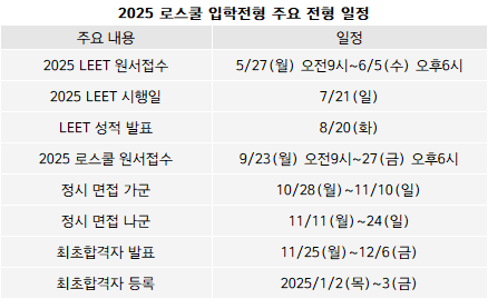 올해 로스쿨 입학전형은 5월27일 LEET 원서접수와 함께 본격적으로 막을 올린다. 6월5일까지 접수를 마무리한 뒤 7월21일 시험이 진행된다. LEET 성적은 8월20일에 발표하며, 2025로스쿨 원서접수는 9월23일부터 27일까지 실시한다. 면접은 가군 모집 대학이 10월28일부터 11월10일 중, 나군 모집 대학이 11월11일부터 24일 중에 치른다. 최초 합격자는 11월25일부터 12월6일 사이 발표하며, 등록기간은 내년 1월2일부터 3일까지다.