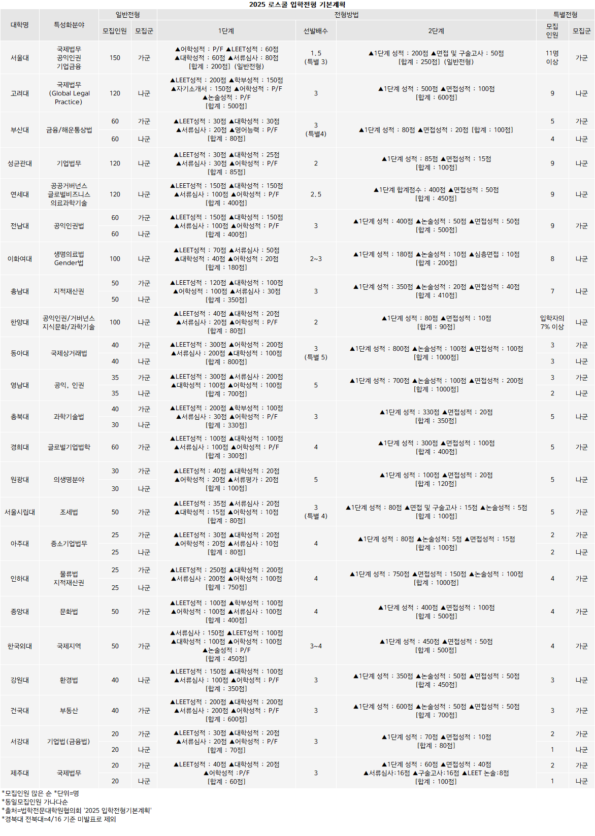전국 25개 로스쿨은 2000명의 모집인원을 유지한다. 아직 경북대와 전북대가 입학전형 기본계획을 발표하지 않은 상황이긴 하지만, 올해도 로스쿨의 총 입학 정원이 2000명으로 동결되는 이상 두 대학도 지난해와 동일한 모집규모를 유지할 것으로 보인다. 군별 모집인원은 가군 902명, 나군 1098명이다. 전형별 모집인원은 일반 1848명(92.4%), 특별 152명(7.6%)이다. 단 특별전형 인원은 입학자의 7% 이상으로 지정된 선발비율에 따라 산출한 것으로 결원충원제도에 따른 최종 선발인원에 따라 달라질 수 있다.