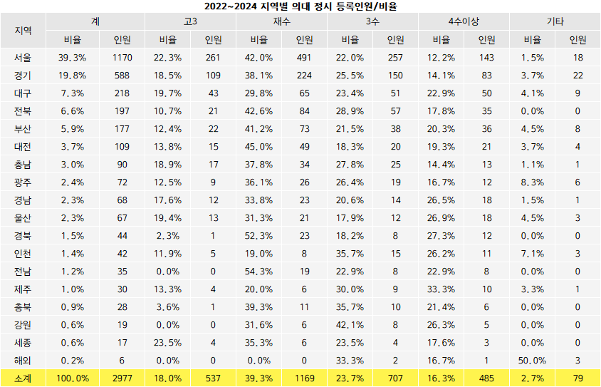 지역별로 살펴보면 수도권과 비수도권 모두 상승했다. 수도권은 2023학년 3.69대1(1100명/4055명)에서 2024학년 3.94대1(1100명/4332명)로, 비수도권은 7.15대1(900명/6432명)에서 7.56대1(900명/6801명)로 상승했다. 비수도권은 계속 상승세를 유지했지만, 수도권은 3년간 하락하다 지난해 반등했다. 최근 청년 취업난에 따른 전문직 선호 상승에 따라 지역을 가리지 않고 로스쿨 경쟁률이 상승한 것으로 보인다.