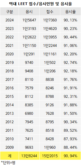 LEET 응시자는 최근 6년 연속 역대 최대치를 경신하고 있다. 지난해 시행된 2024LEET의 경우 응시인원은 1만5647명이나 됐다. 지원자 1만7360명의 90.13%에 해당되는 인원이다. 전년 1만3193명보다 2454명이 늘어난 규모로, 2009년부터 총 15회 시행된 LEET 역사상 가장 많은 인원이 응시했다. 2019학년부터 시작된 역대 최다 응시생 기록이 6년 연속 경신됐다.