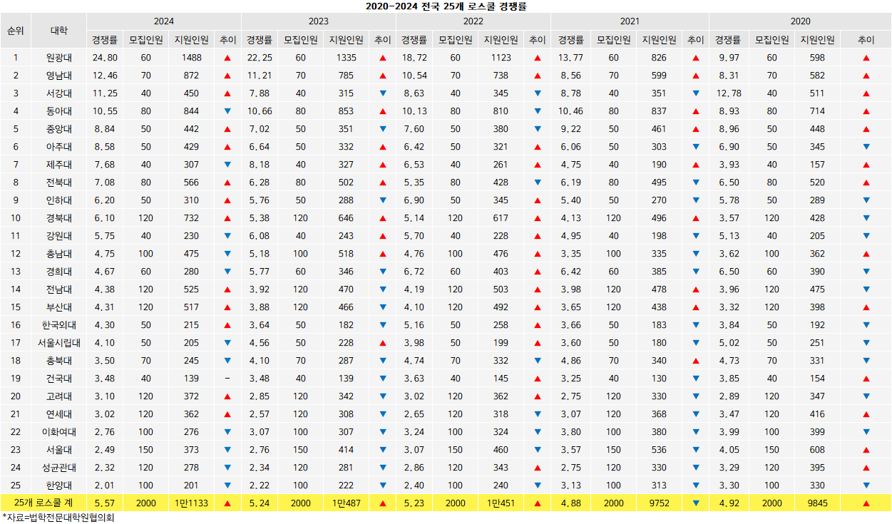 2024학년 전국 25개 로스쿨의 최종 경쟁률은 5.57대1(모집 2000명/지원 1만1133명)로 마감했다. 전년 5.24대1(2000명/1만487명)보다 상승했다. 로스쿨 경쟁률 상승은 LEET 응시자가 역대 최다 인원을 기록하면서 예견됐던 상황이다. 동일 모집 인원에 지원인원이 646명 증가했다. 최고 경쟁률은 원광대가 기록했다. 60명 모집에 1488명이 지원해 24.8대1이다. 원광대는 2021학년부터 4년 연속 최고 기록을 경신하고 있다. 원광대에 이어 영남대 서강대 순으로 톱3다. 영남대는 12.46대1(70명/872명), 서강대는 11.25대1(40명/450명)을 기록하면서 전년 대비 상승했다. 영남대는 3년 연속 2위를 지키고 있으며, 서강대가 큰 폭으로 상승한 것이 눈에 띈다. 이어 동아대 10.55대1(80명/844명), 중대 8.84대1(50명/442명)까지 톱5다.