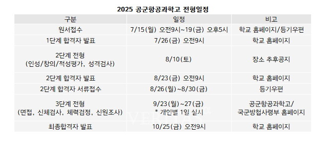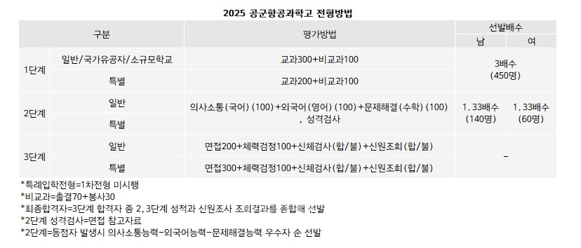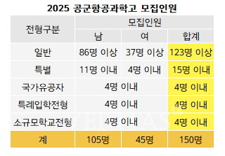 [베리타스알파=김하연 기자] 군 관련 항공기술 분야 마이스터고인 공군항공과학고(이하 항과고)가 2025학년 신입생 입학전형 요강을 18일 공개했다. 올해 남학생 105명, 여학생 45명으로 총 150명을 모집한다. 남학생 70%, 여학생 30%의 비율이다. 전체 모집인원은 지난해와 동일하지만 세부모집인원에 변화가 있다. 올해 특례입학전형과 소규모학교전형의 2개 전형을 신설해 각각 4명(모집 정원의 3% 이내)을 모집한다. 특례입학은 외국의 학교에서 2년 이상 재학하고 귀국한 학생이거나 북한이탈주민학생 등 특례입학대상자가 대상이다. 소규모학교는 읍/면에 소재하고 3학년이 1개 학급인 소규모 학교 출신자가 지원할 수 있다.