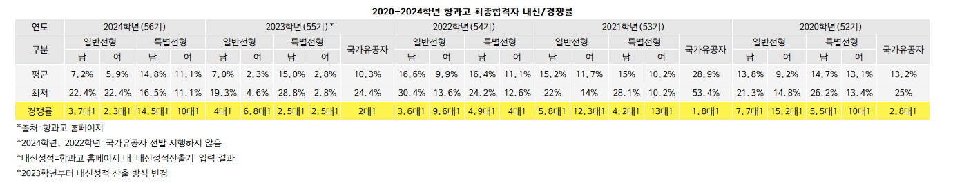 항과고는 수요자 배려 차원에서 지난해 합격자의 내신성적도 공개했다. 항과고 홈페이지 내 공지돼 있는 ‘내신성적 산출기’를 통해 산출한 결과로, 2024학년 일반전형 기준 평균 내신성적이 남학생은 7.2%, 여학생은 5.9%다. 커트라인이 되는 최저 성적은 남학생과 여학생 모두 22.4%다. 항과고 내신성적 산출기는 2023학년에 변경된 것으로 2022학년 이전에 공지된 내신성적과 산출 방식이 다르다는 점에 유의해야 한다.