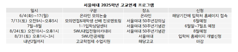 [베리타스알파=김하연 기자] 서울여대가 2025학년 고교대학연계 프로그램 운영 일정을 최근 공개했다. 서울여대는 올해 학생/학부모/교사를 대상으로 온라인 모의논술부터 모의면접, 1:1입학상담, SWU대입전형아카데미, SWU전공체험, 고교학점제 수업지원까지 풍성한 프로그램을 마련해 수험생들의 대입 준비를 돕는다.