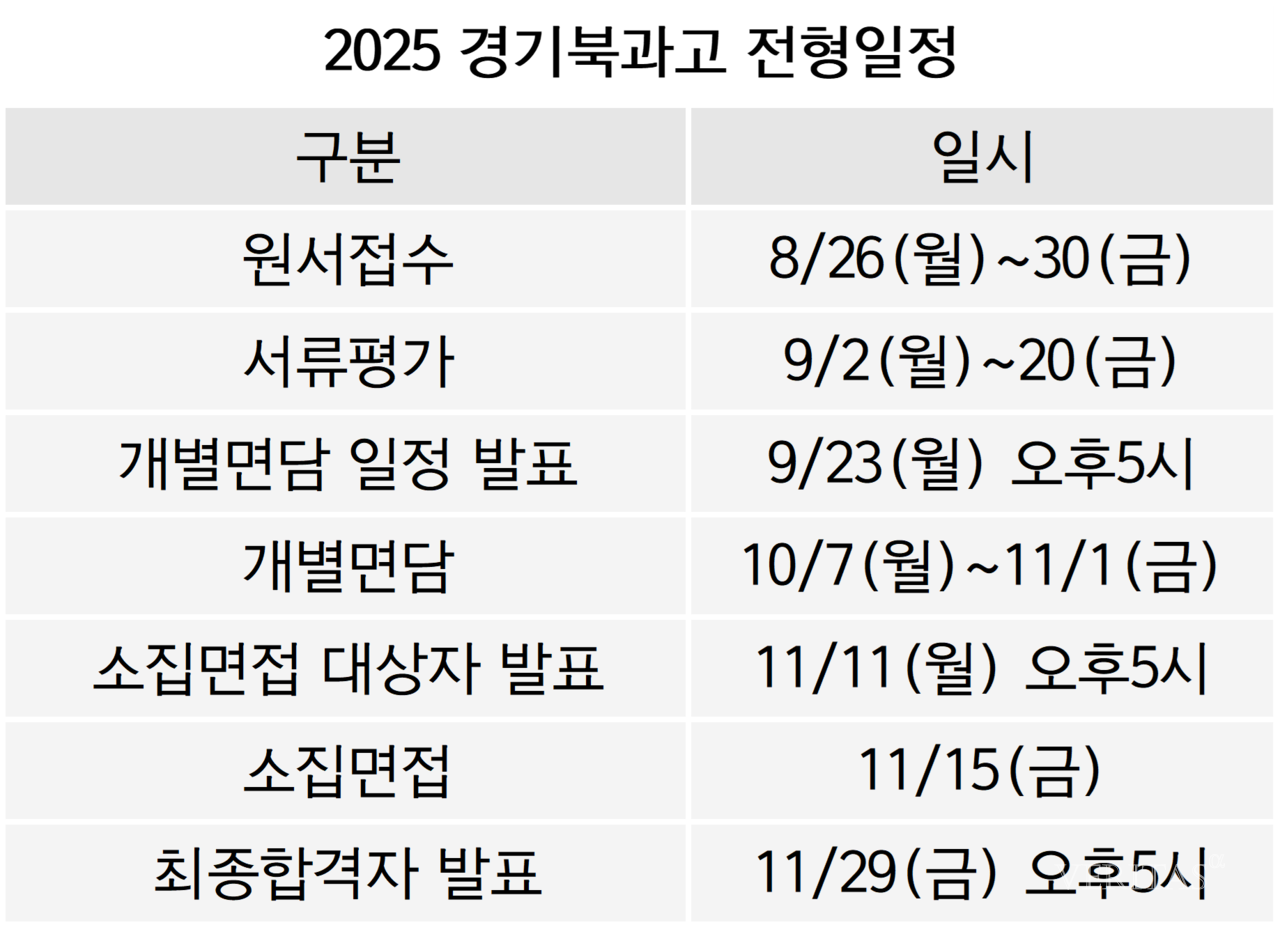 경기북과고 원서접수는 8월26일부터 30일까지다. 개별면담 일정은 9월23일 오후5시에 발표한다. 개별면담은 10월7일부터 11월1일 중 실시하며, 소집면접 대상자는 11월11일 오후5시에 발표한다. 소집면접은 11월15일에 실시할 예정이다. 최종 합격자는 11월29일 오후5시에 홈페이지에 안내한다.