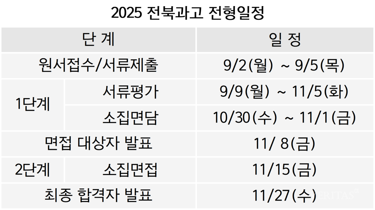 원서접수 일정은 9월2일부터 5일 오후5시까지다. 지원자의 소속 중학교 또는 출신 학교의 NEIS 원서작성 프로그램을 통해 온라인 원서를 작성 후 제출하면 된다. 광주 출신 지원자는 전북교육청 고등학교 입학전형포털시스템의 ‘타 시도 원서작성’에서 원서를 작성해 제출하면 된다. 검정고시 출신 등 중학교 졸업자와 동등의 학력이 있다고 인정될 경우에는 전북과고에서 온라인 작성 후 제출하면 된다. 자소서와 추천서 등 서류 제출기한도 9월2일부터 5일 오후5시까지다.