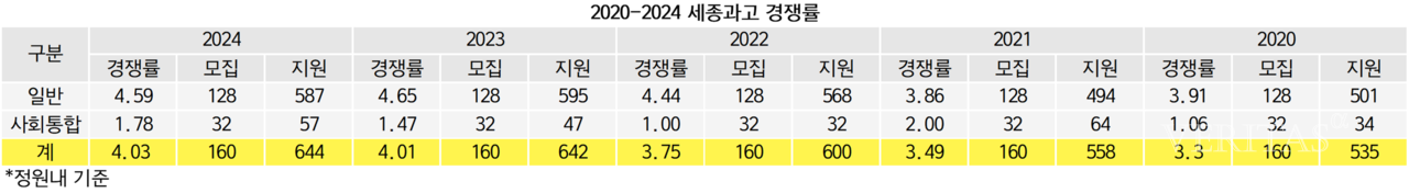 지난해 세종과고의 경쟁률은 4.03대1이었다. 160명 모집에 644명이 지원했다. 전년인 2023학년과 비교하면 4.01대1에서 소폭 상승했지만 변동 폭이 크지 않다. 동일 모집인원이 지원자가 2명이 늘었다.