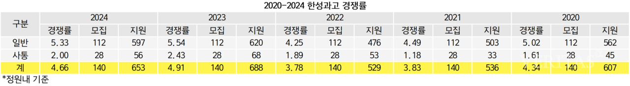 지난해 한성과고의 경쟁률은 4.66대1을 기록했다. 정원내 140명 모집에 653명이 지원한 결과다. 전년인 2023학년과 비교하면 지원자가 35명 줄면서 경쟁률이 하락했다.