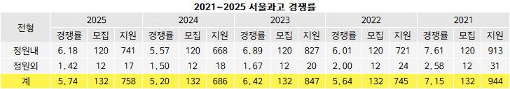 [베리타스알파=조혜연 기자] 27일 원서접수를 마감한 서울과고의 2025 신입학 경쟁률은 정원내 기준 6.18대1로 마감했다. 120명 모집에 741명이 지원했다. 지난해와 비교해 경쟁률이 크게 상승했다. 지난해의 경우 동일 모집인원에 668명이 지원해 5.57대1의 경쟁률이었다. 지원자가 73명 늘어난 결과다.
