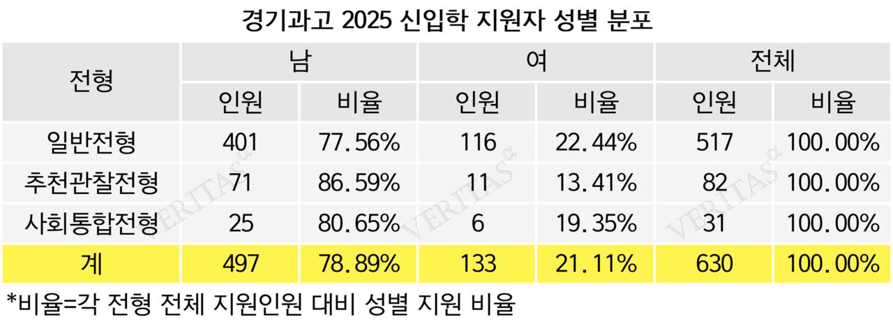지원자를 성별로 구분해보면 남학생이 압도적으로 높았다. 전체 지원자 630명 가운데 남학생이 78.89%(497명), 여학생이 21.11%(133명)를 차지했다. 전형별로 구분해보면 일반전형 지원자 517명 중 남학생 비율이 77.56%(401명), 여학생이 22.44%(116명)다. 추천관찰전형과 사회통합전형에서는 남초현상이 더욱 두드러졌다. 추천관찰전형 지원자 82명 중 남학생이 86.59%(71명)로 대부분을 차지했고, 여학생은 13.41%(11명)에 불과했다. 사회통합전형 지원자 31명 중에서는 남학생이 80.65%(25명), 여학생이 19.35%(6명)다.