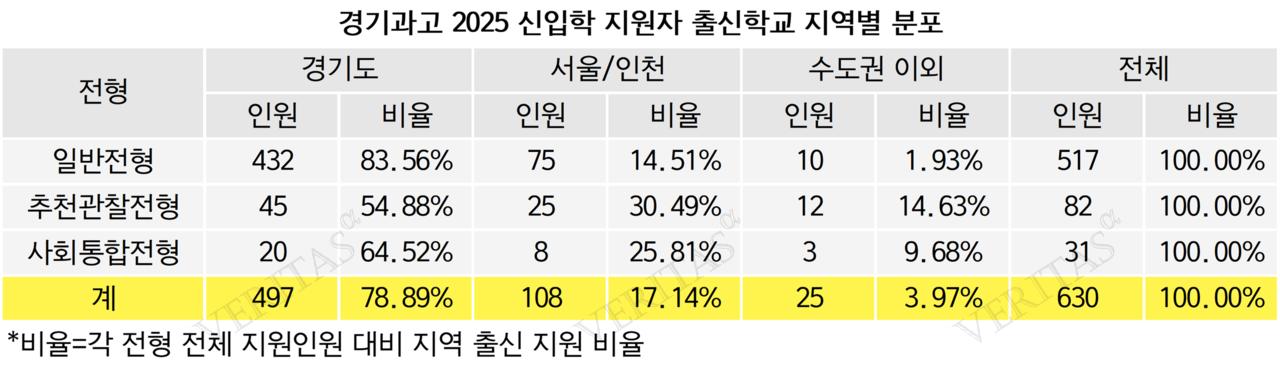 지원자를 지역별로 구분해보면 소재지인 경기의 쏠림이 두드러졌다. 2025학년의 경우 경기 출신이 78.89%(497명)로 가장 많고, 이어 서울/인천 17.14%(108명), 비수도권 3.97%(25명) 순으로 나타났다. 특히 일반전형은 경기 출신이 83.56%(432명)로 대부분을 차지했고, 이어 서울/인천 14.51%(75명), 비수도권 1.93%(10명)였다. 사회통합전형은 경기 출신이 64.52%(20명), 서울/인천 25.81%(8명), 비수도권 9.68%(3명)로 나타났다. 추천관찰전형은 경기 출신의 비중이 54.88%(45명)로 세 전형 중 가장 낮았다. 이어 서울/인천 30.49%(25명), 비수도권 14.63%(12명)로 비교적 지역적 분포가 넓다.