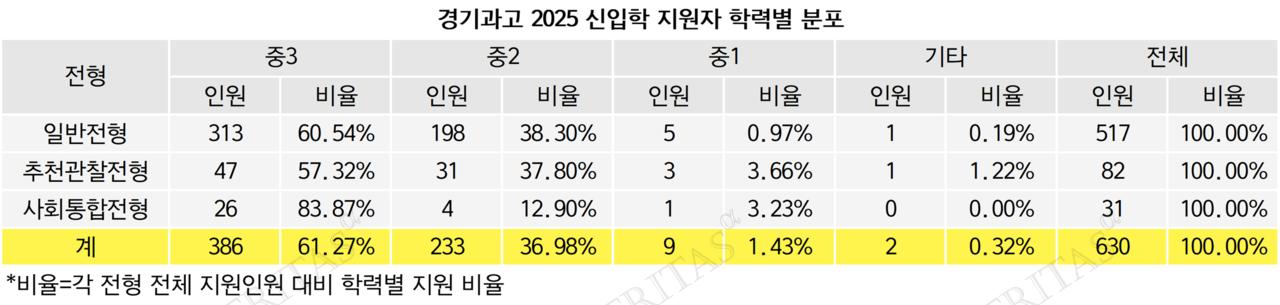 지난해인 2024학년에는 전체 지원자 672명 중 중3은 62.31%(405명), 중2가 36.77%(239명), 중1이 0.77%(5명)를 차지했다. 지난해보다 올해 중3의 비중이 줄고 중2와 중1의 비중이 늘어난 셈이다. 지난해 전형별로는 일반전형 지원자 650명 가운데 중3이 62.31%(405명), 중2가 36.77%(239명), 중1이 0.77%(5명)를 차지했다. 사회통합대상자를 선발했던 지난해 추천관찰전형 지원자 22명 중에서는 중3이 77.27%(17명), 중2가 18.18%(4명)였다.