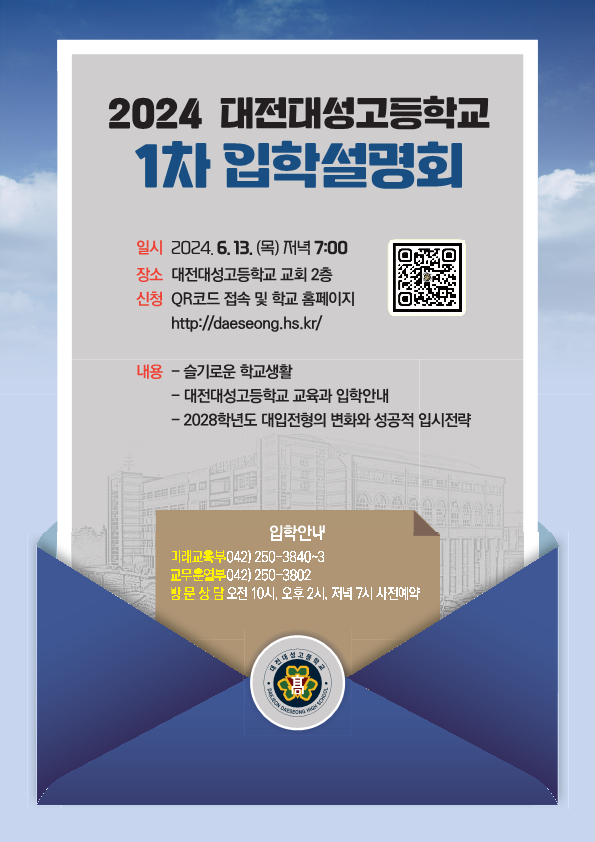 [베리타스알파=조혜연 기자] 대전대성고가 2024학년 1학기 입학설명회 일정을 발표했다. 6월13일 오후7시에 대전대성고 교회 2층에서 진행한다. 대전광역시 소재 중학교 3학년 학생과 학부모를 대상으로 하며 학교생활, 대전대성고 교육과 입학안내, 2028대입의 변화와 성공적 입시전략 등을 안내할 예정이다. 설명회 신청은 현재 학교 홈페이지-입학안내-입학관련 공지에 게시된 링크를 통해 가능하다.