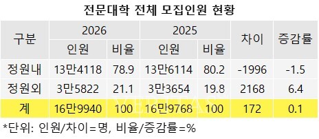 정원내외 합산 총 16만9940명을 모집한다. 전년 16만9768명과 비교해 172명 늘었다. 정원내 인원이 13만4118명으로 전년 13만6114명보다 1996명 감소한 반면, 정원외 인원이 3만5822명으로 전년 3만3654명보다 2168명 늘었다. 비수도권 전문대학 성인학습자 정원외 모집인원 제한이 사라지면서 규모가 확대된 영향이다.