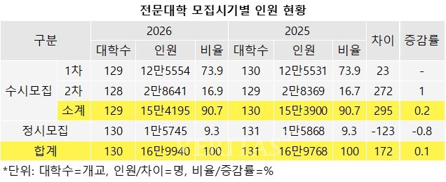 2026학년 수시 선발비중은 90.7%로 비중 자체는 전년과 동일하다. 인원으로 따지면 15만4195명을 선발, 전년 15만3900명보다 295명(0.2%) 증가한다. 전문대 수시모집은 1차, 2차로 나뉘며 1차에 많은 비중을 두고 있다. 1차모집에선 12만5554명(73.9%)을, 2차 모집에서는 2만8641명(16.9%)을 선발한다. 정시의 경우 1만5745명을 선발, 전년 1만5868명보다 123명 줄었다.