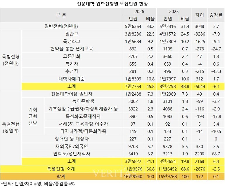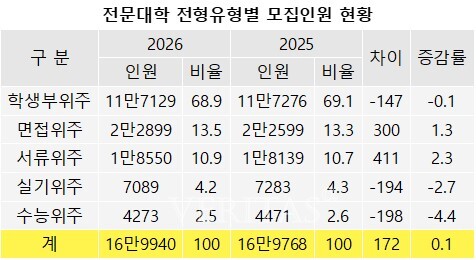 2026학년 전문대학 전체 모집인원은 16만9940명으로, 전년보다 172명(0.1%) 증가한다. 정원내 인원은 줄었지만 정원외에서 확대됐다. 정원외 특별전형 비수도권 만학도/성인재직자 모집인원이 늘어난 영향으로 풀이된다. 고등교육법 시행령 개정으로 비수도권 전문대학의 성인학습자 정원외 전형 모집인원 제한이 폐지됐기 때문이다. 이를 통해 재직자, 외국인, 성인학습자 등 다양한 입학자원을 발굴해나갈 계획이다.