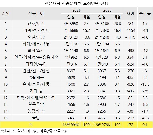 전공별로는 2026학년 역시 간호/보건 분야에서 가장 많이 모집한다. 4만5950명 규모로 전체의 27%를 차지한다. 기계/전기전자 2만6686명(15.7%), 호텔/관광 2만3129명(13.6%), 회계/세무/유통 1만1196명(6.6%), 외식/조리 1만1148명(6.6%) 순으로 톱5다.