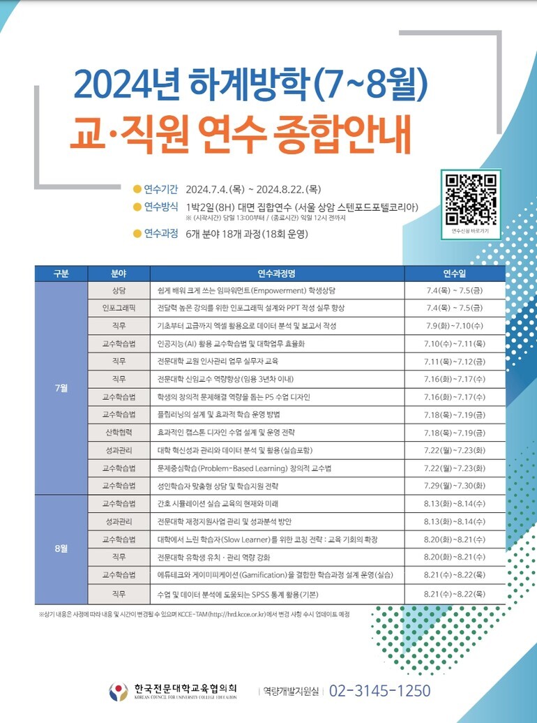 서헌 전문대교협 역량개발지원실장은 “이번 하계방학 연수는 대학 교직원들의 대면 집합 연수 요구를 반영했고, 그들의 직무역량을 향상시키기 위해 다양한 연수 과정을 개설했다”며 “앞으로도 교직원들의 전문성을 지속적으로 향상시키기 위한 다양한 프로그램을 개발하고 지원할 계획이다”고 강조했다. 또 “올해부터는 초중고 교직원의 직무역량 및 자기개발을 위한 교육정보를 습득할 수 있도록 연수 참여 대상자를 확대했기에 최신 인공지능(AI)활용 방법, 엑셀 활용 기술, 느린 학습자의 코칭 등 전국 교직원들도 참여해 새 교육 정보를 습득하고 자기 개발의 기회로 삼기 바란다”고 덧붙였다.