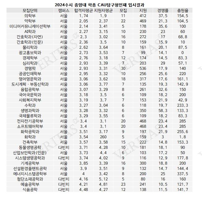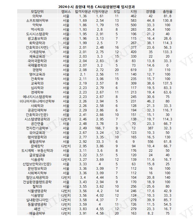 대략적인 지원경향만을 파악하기 위해 학종 입결을 살펴보면 CAU융합형에선 의학부가 1.36등급으로 합격자 평균 교과성적이 가장 높다. 지원자 평균은 1.61등급이었다. 이어 소프트웨어학부 1.69등급(2.54등급), 약학부 1.86등급(1.79등급), 역사학과 1.93등급(2.8등급), 도시시스템공학 1.95등급(2.91등급), 광고홍보학과 1.96등급(3.13등급)까지 톱5다.