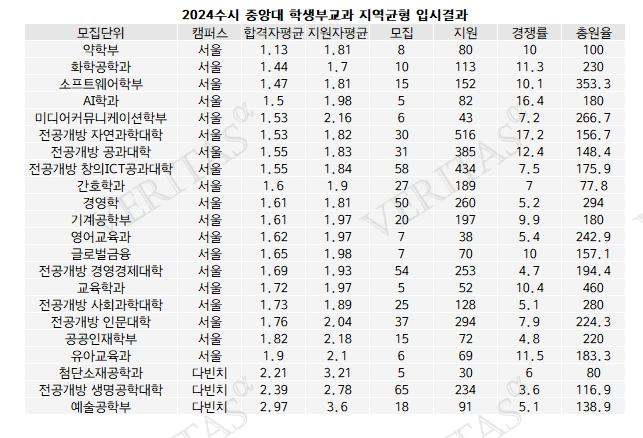 중앙대가 공개한 2024학년 수시 교과전형 지역균형 선발결과를 살펴보면 합격자 평균 기준 약학부의 합격선이 1.13등급으로 가장 높게 형성됐다. 지원자 평균 등급은 1.81등급이었다. 이어 화학공학과 1.44등급(지원자평균 1.7등급), 소프트웨어학부 1.47등급(1.81등급), AI학과 1.5등급(1.98등급), 미디어커뮤니케이션학부 1.53등급(2.16등급) 순으로 톱5다.