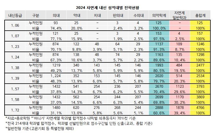 성적 범위대를 넓혀봐도 의약계열 쏠림은 뚜렷하다. 내신 최종등록자 70%컷 기준으로 살펴보면 내신 1.07등급이내 157명 중 의약계열이 153명(97.5%), 자연계 일반학과는 4명(2.5%)에 불과했다. 의약계열은 세부적으로 의대 121명(77.1%), 약대 25명(15.9%), 수의대 4명(2.5%), 한의대 3명(1.9%)이다. 내신 1.23등급이내도 전체 1246명 중 의약 1137명(91.3%), 자연계 일반 109명(8.7%)이다. 의약계열은 의대 874명(70.1%), 약대 122명(9.8%), 한의대 64명(5.1%), 치대 48명(3.9%), 수의대 29명(2.3%)이다. 내신 1.38등급 이내는 2477명 중 의약 1993명(80.5%), 자연계 일반 484명(19.5%)이다. 의약계열은 의대 1219명(49.2%), 약대 340명(13.7%), 수의대 146명(5.9%), 한의대 145명(5.9%), 치대 143명(5.8%)이다. 내신 1.57등급 이내는 3793명 중 의약 2670명(70.4%), 자연계 일반 1123명(29.6%)이다. 세부적으로 의대 1432명(37.8%), 약대 541명(14.3%), 치대 254명(6.7%), 한의대 236명(6.2%), 수의대 207명(5.5%), 자연계 일반학과 1123명(29.6%)이다.