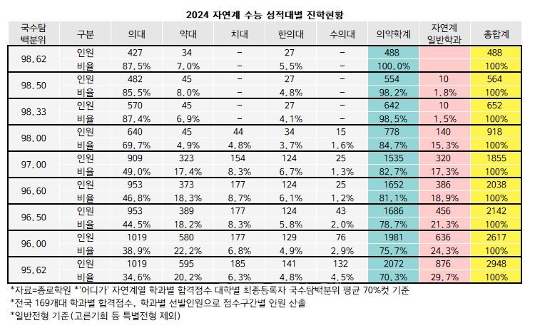정시로 살펴보면 의약계열 쏠림이 보다 뚜렷했다. 수능 국수탐 백분위 평균 98.62점(상위 1.38%) 이내의 488명 전원이 의약계열로 진학했다. 이 중 의대의 비중이 87.5%에 달한다. 범위를 넓혀 살펴봐도 98.5점 이내 564명 중 의약계열이 554명(98.2%)이며 자연계 일반학과는 10명(1.8%)에 불과했다. 98.33점까지도 마찬가지로 652명 중 자연계 일반은 10명(1.5%), 의약이 642명(98.5%)이다. 특히 570명(87.4%)이 의대에 진학했다. 국수탐 평균 상위 4% 이내, 1등급에 해당하는 백분위 96점 기준으로 살펴보면 2617명 중 1981명(75.7%)가 의약계열에 진학했다. 자연계 일반학과를 택한 수험생은 636명뿐이다.