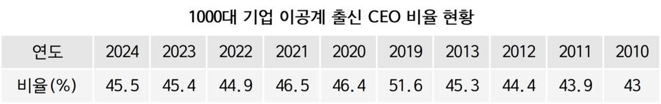 출신 전공은 단연 경영(22.9%) 경제(9.2%)의 비율이 가장 높다. 이공계 출신 비율은 절반이 안 되는 45.5%인 것으로 나타났다. 지난해 45.4%에서 0.1%p 소폭 상승했다. 이공계 CEO 출신 비율은 2010년 43%, 2011년 43.9%, 2012년 44.4%, 2013년 45.3%로 40% 이상 수준을 보이다가 2019년에 51.6%를 기록, 처음으로 50%를 상회했다. 이후 2020년 46.4%, 2021년 46.5%, 2022년 44.9%, 지난해 45.4%였다. 올해 기준 이공계 학과 가운데선 화공(8.1%) 전자전기공(6.7%) 기공(6.1%) 순으로 비율이 높았다.