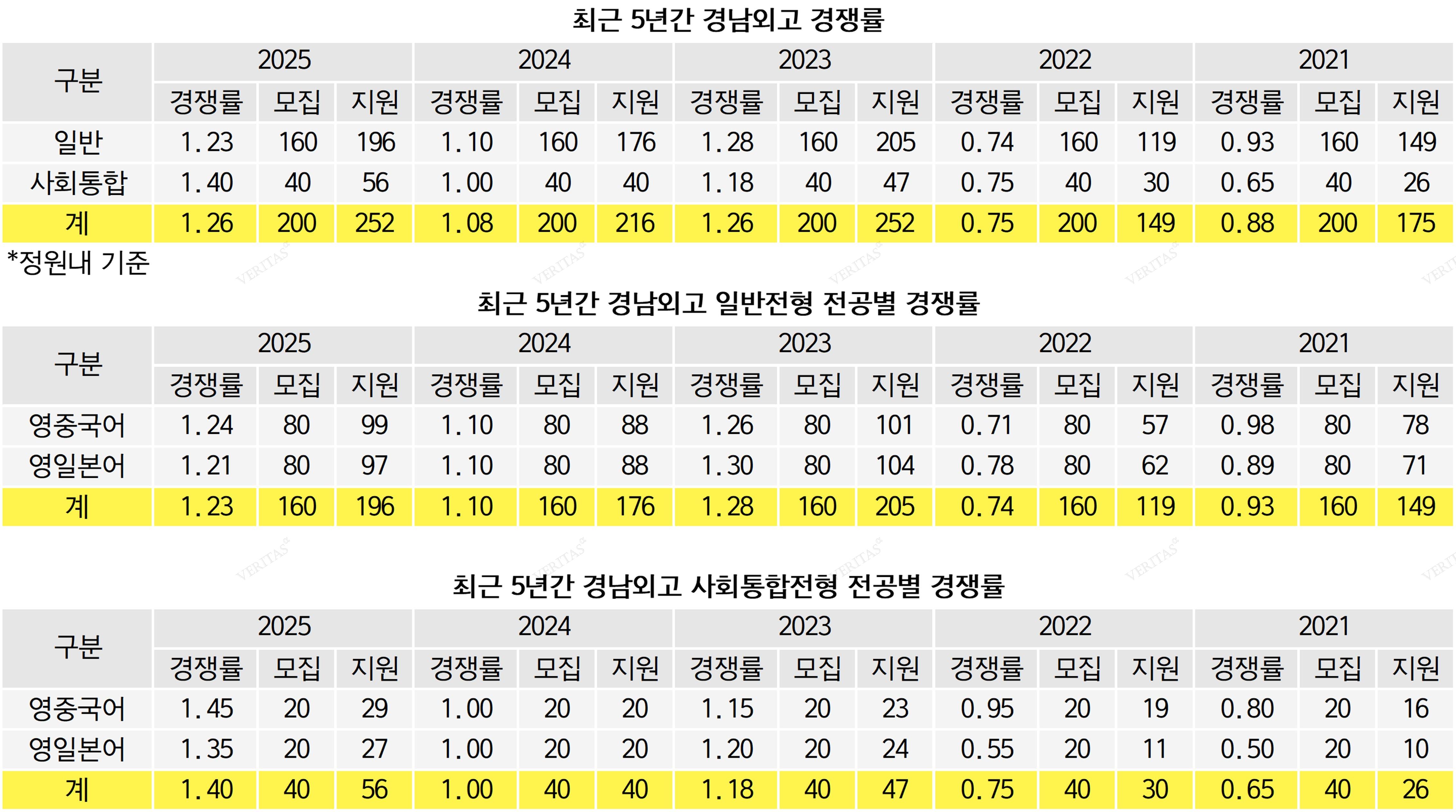 [베리타스알파=이상현 기자] 16일 오후5시 원서접수를 마감한 경남외고의 2025학년 신입학 모집 경쟁률은 정원내 1.26대1이다. 200명 모집에 252명이 지원했다. 지난해 1.08대1(모집 200명/지원 216명)과 비교 시 지원자가 36명 늘어 경쟁률이 상승했다. 전형별로는 일반 1.23대1(160명/196명), 사회통합 1.4대1(40명/56명)로 지난해 대비 모두 올랐다.