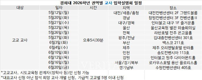 경희대는 권역별 교사 대상 입학설명회 일정도 함께 공개했다. 5월12일 대전/세종/충청 지역을 시작으로 6월20일 경기남부까지 총 12회 예정됐다. 세부 일정은 경희대 소개, 입학전형 안내 및 2024년 입결 분석, 학종 모의 서류 평가, 모의 평가 결과 공유와 논의, 질의응답으로 이루어졌다. 신청기간은 4월21일 오전10시부터 선착순으로 마감하며, 참석을 희망하는 교사는 개별적으로 신청해야 한다. 고교교사나 시도교육청 관계자(장학사 등)만 신청 가능하다. 학생/학부모 입학설명회와 마찬가지로 사전 신청자 외 현장등록은 불가능하다. 경희대는 많은 고교의 참석을 위해 가급적 고교별 5명 이내로 신청해달라고 덧붙였다.